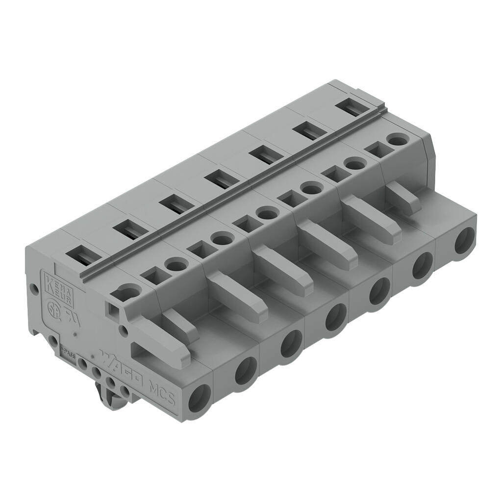 Female plug; 7-pole; snap-in mounting feet; 12 AWG max; pin spacing 7.5 mm; 1 conductor per pole; gray