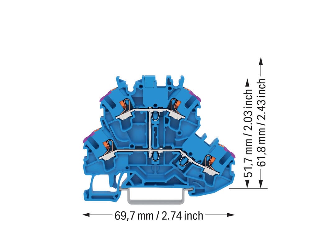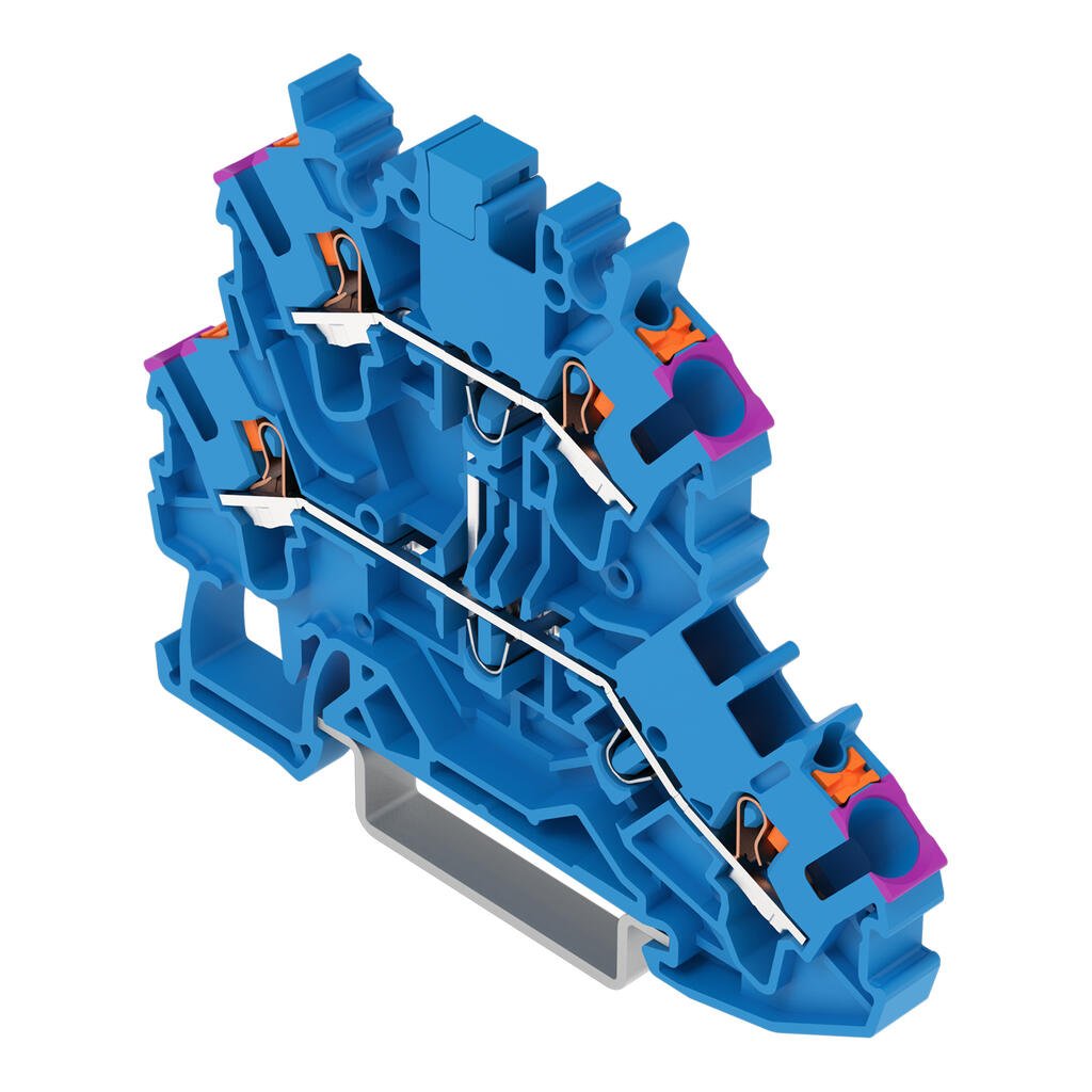 złączka 2-piętrowa; z przyciskami; złączka przelotowa 4-przewodowa; N; bez podstawki oznacznika; do zastosowań Ex e II oraz Ex i; z mostkowaniem wewnętrznym; otwory na przewody z fiolet. nadrukiem; na szynę TS 35 x 15 i 35 x 7,5; 2,5 mm²; Push-in CAGE CLAMP®; 2,50 mm²; niebieski