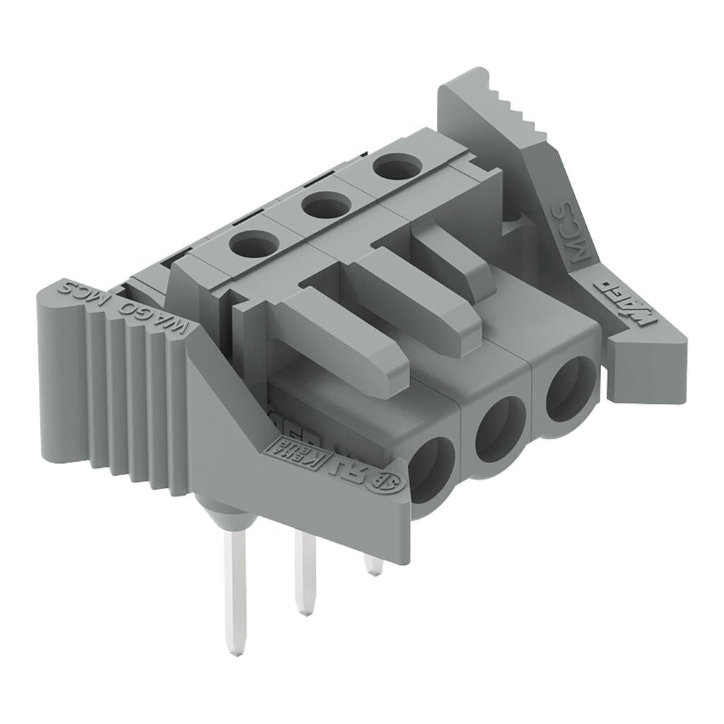 gniazdo do złączek listwowych; piny 0,6 x 1 mm; konstrukcja kątowa; zaczep ryglujący; raster 5 mm; 3-bieg.; szary