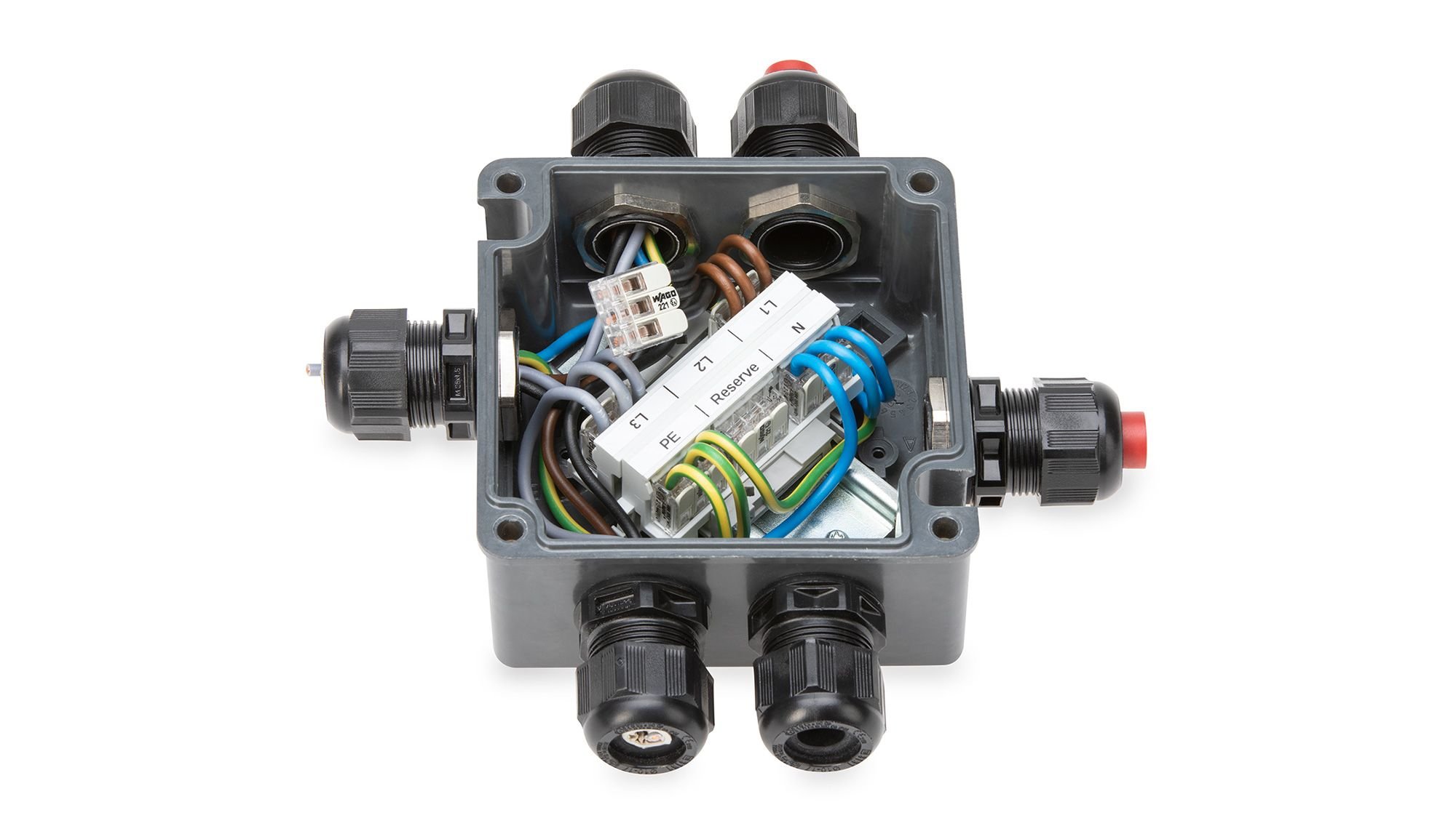 Wo viele Leitungen aufeinandertreffen, kann es unübersichtlich werden. Die WAGO Verbindungsdose schafft hier Abhilfe und ordnet den Anschluss von bis zu 60 Leitern mit der WAGO COMPACT-Verbindungsklemme der Serie 221 für alle Leiterarten mit Querschnitten bis 4 mm2.