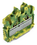 2-johdin-pienoisläpimenoliitin; sis. käyttöaukot; 2,5 mm²; Liitin ilman kiinninapsautettavaa jalkaa ja asennuslaippaa; reuna- ja keskimerkintä; testausportilla; Paikalleen työnnettävä CAGE CLAMP®; 2,50 mm²; vihreä-keltainen
